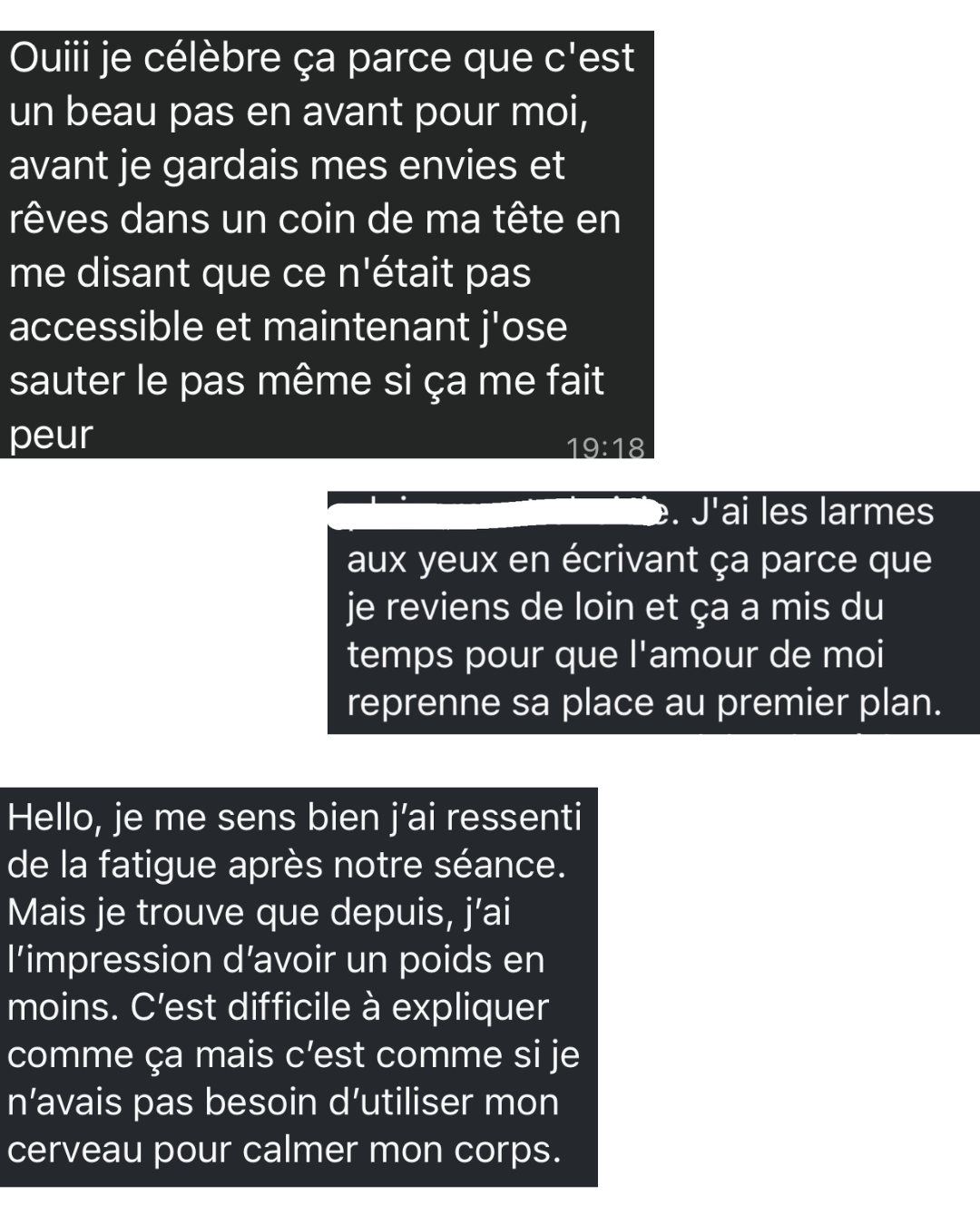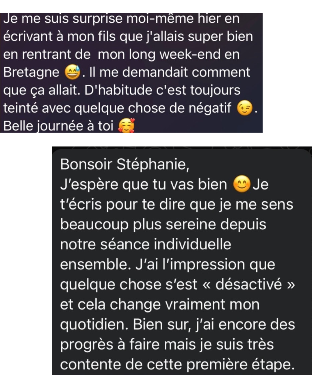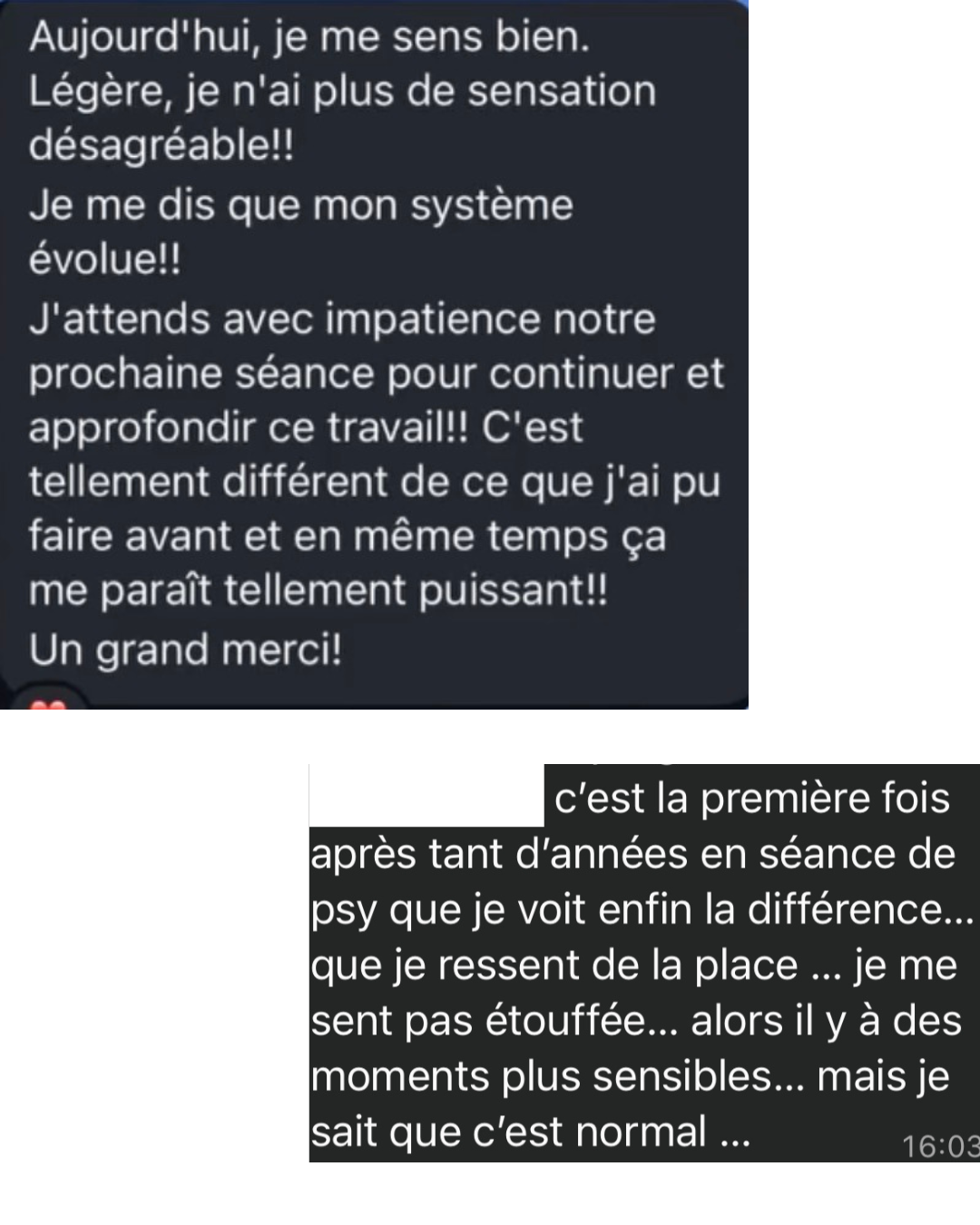 Les pensées se calment, les croyances se réajustent, les symptômes s’apaisent naturellement et la sécurité intérieure se réinstalle.